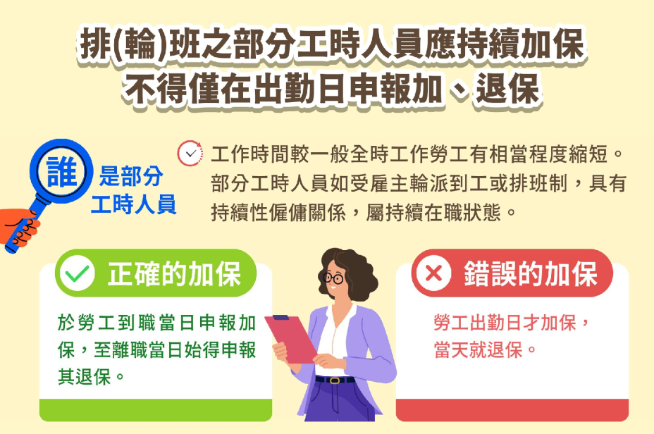 事業單位因應經營需求,除僱用一般全時工作勞工外,也會僱用部分工時勞工,勞動部提醒,排(輪)班之部分工時勞工,即使非每日出勤,只要雙方持續具有僱傭關係,雇主依規定應於勞工到職當日申報參加勞工保險、就業保險及勞工職業災害保險,於勞工離職當日申報退保,也就是雇主應於勞工整段在職期間持續加保,不得僅於勞工出勤日當天辦理加、退保,以維護勞工權益。